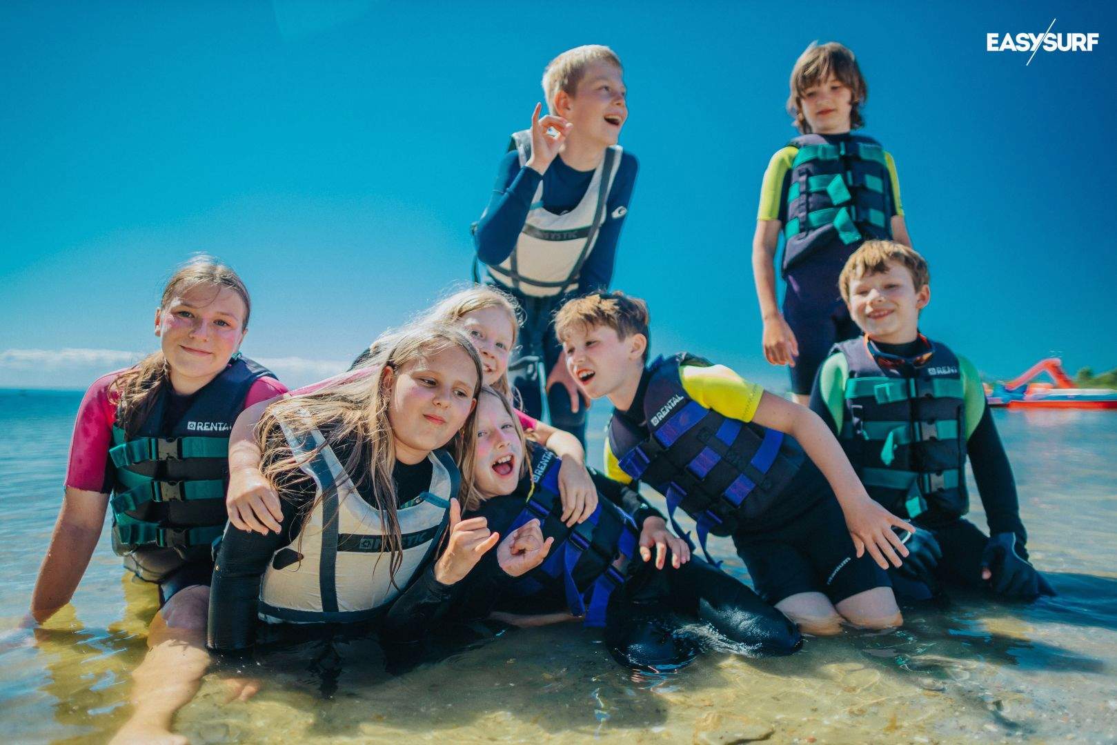 Nie wymagamy perfekcyjnych umiejętności pływackich – dzieci mają kamizelki asekuracyjne i są cały czas pod okiem wykwalifikowanej kadry. Jednak oswojenie z wodą i brak lęku przed nią są mile widziane.
